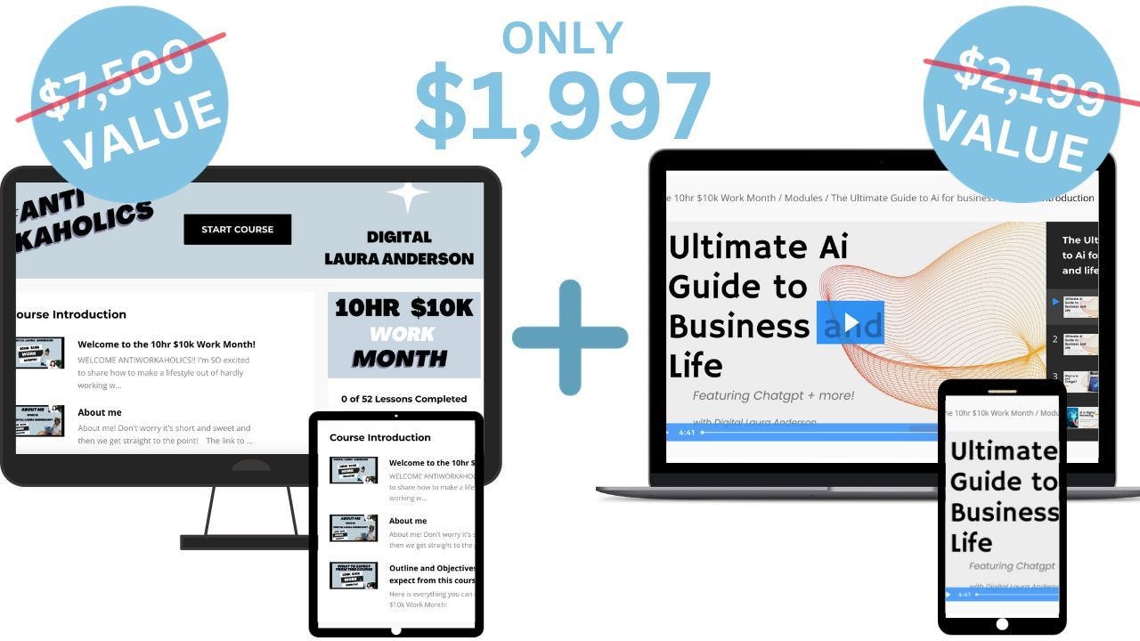 Full in-depth course to take you from the ground up in your 10hr $10k Work Month. You'll learn how to take a Digital Skill, how to market/position yourself to attract and close high-paying clients, AND how to outsource the work and streamline it with Ai/chatgpt so you're sittin' pretty making money while hardly working.